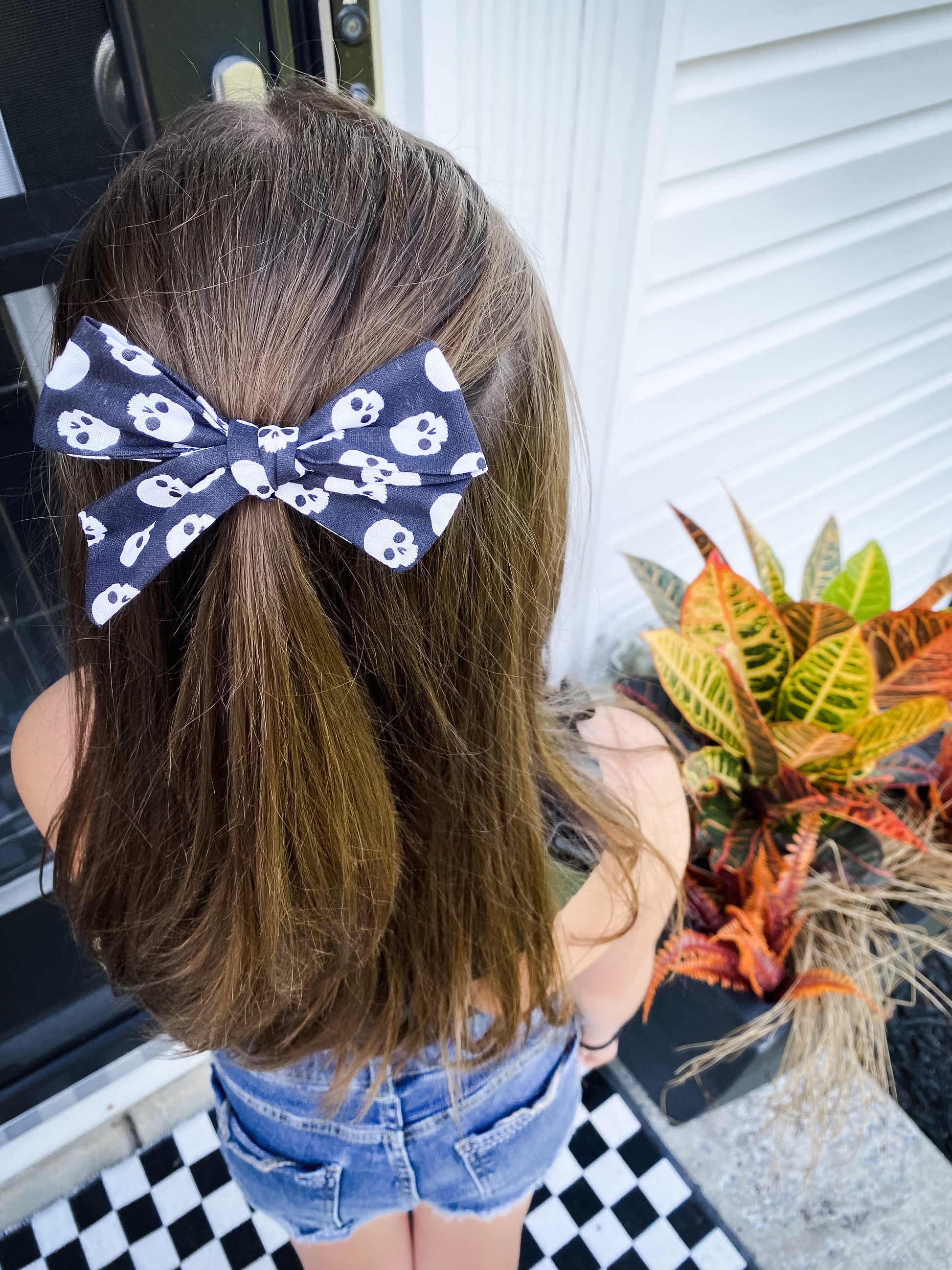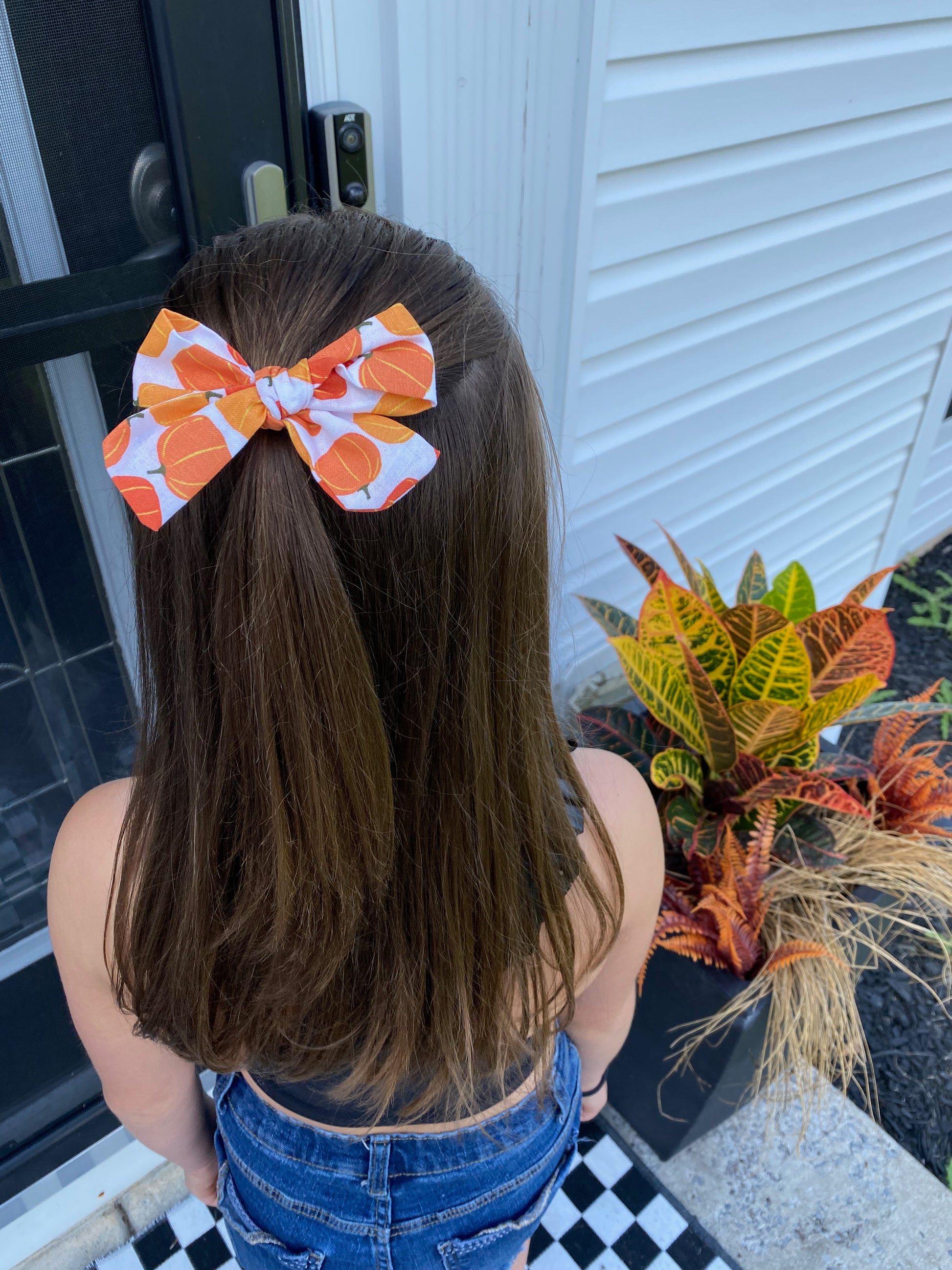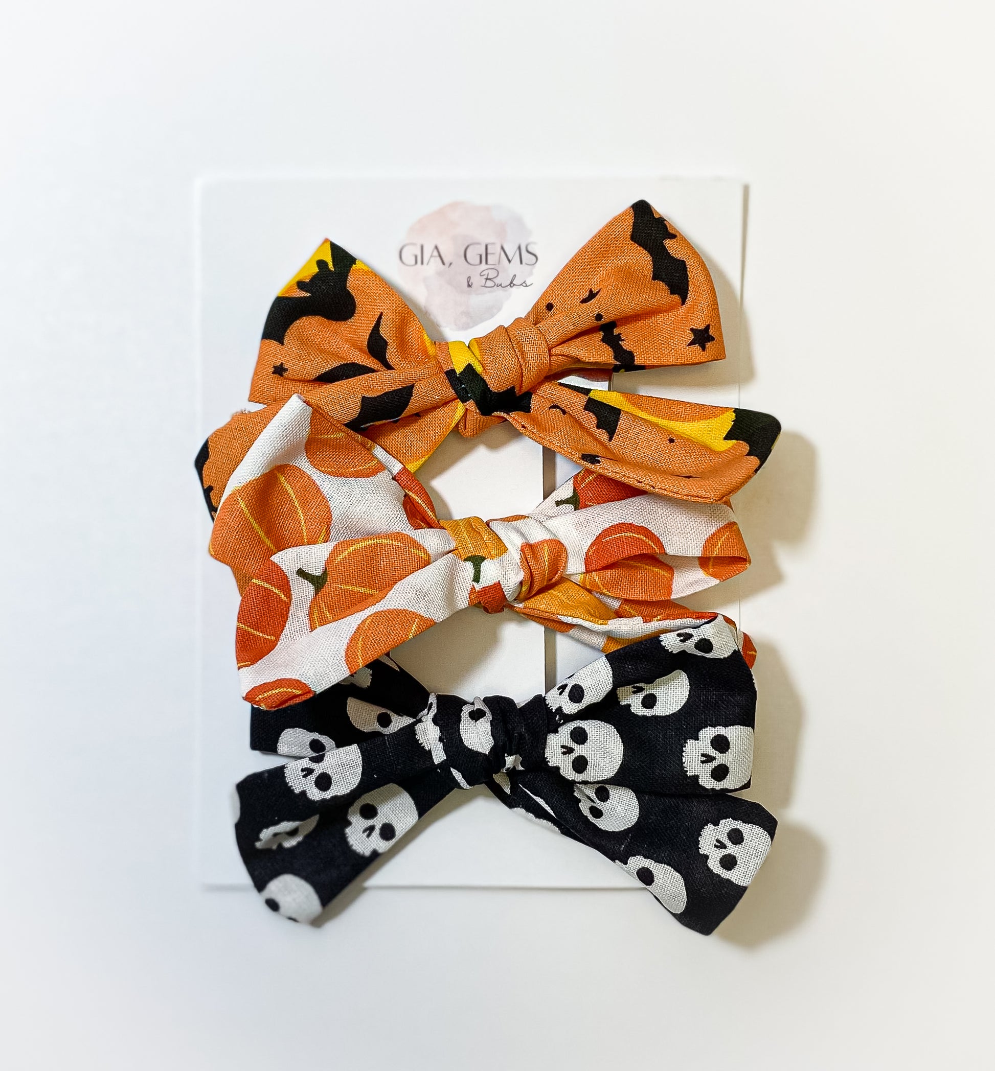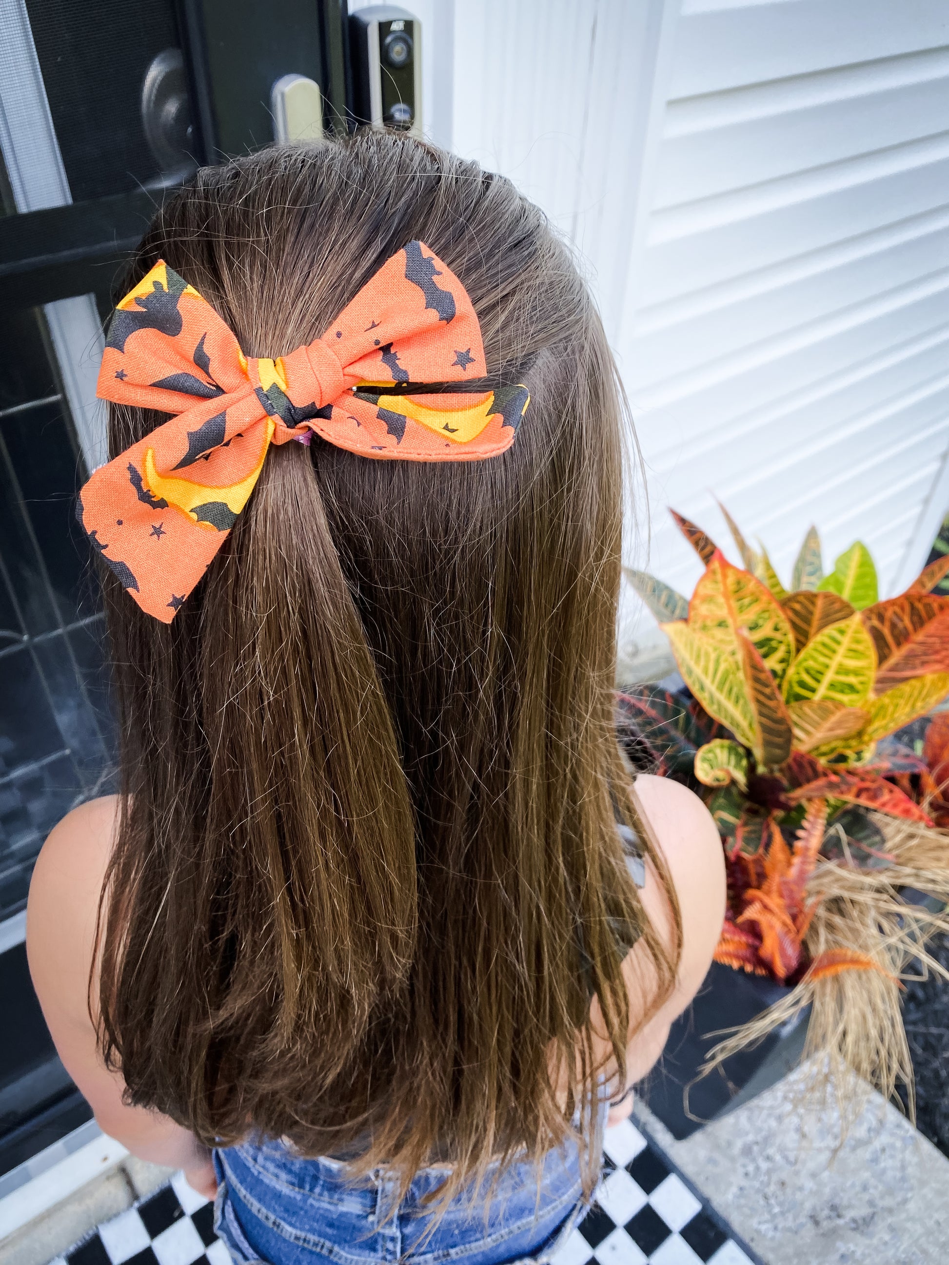 Dive into the festive spirit with our medium-sized Halloween Alligator Clip Bows. Expertly crafted in three spooktacular designs - a sleek black adorned with skeleton heads, a vibrant orange sprinkled with black bats, stars, and moons, and a pristine white graced with classic pumpkins. The removable alligator clips make styling effortless, ensuring your little one stands out this Halloween season. Perfect for festive photoshoots or Halloween parties.